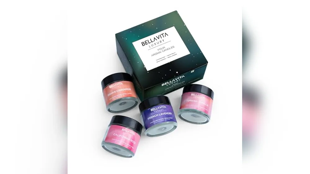 This set includes four soy wax votive candles scented with vanilla, cinnamon, lavender, and rose, designed for smaller areas like a working desk or bathroom. The candles burn up to 15 hours, providing a clean, smoke-free flame without residue, which is beneficial for sensitive settings.