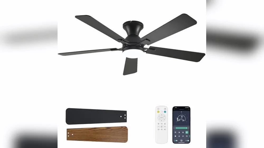 The Dolavast 52-Inch Black Ceiling Fan with Light is a modern flush-mount ceiling fan designed for bedrooms and living rooms, combining efficient airflow with integrated LED lighting. It solves the problem of noisy fans and inconvenient controls by featuring an ultra-quiet reversible DC motor and smart app plus remote control, allowing easy adjustment of fan speed, light brightness, and color temperature without leaving your seat.